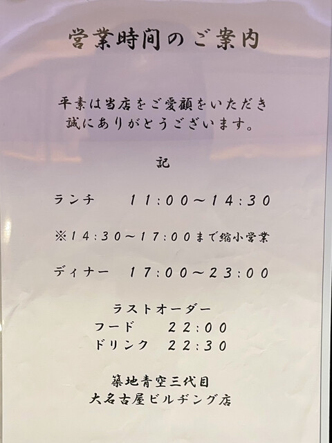 L.O. 料理22:00 ドリンク22:30