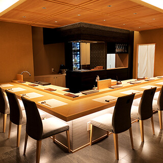 握り手である大将と共に、焼き手専門の料理人が板場に立ち、華麗な焼き技を披露。洋のテイストを加えた「炭火焼き上げ」で、黒毛和牛、旬魚や高級魚介の皿を提供。一つのコースで魚介と和牛の両方を満喫できます。