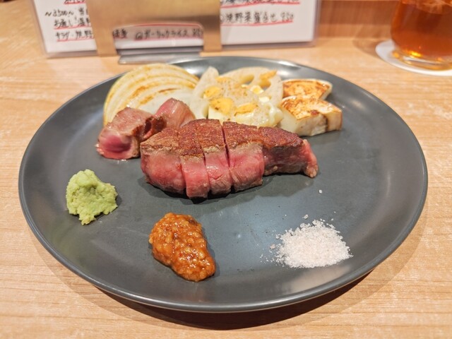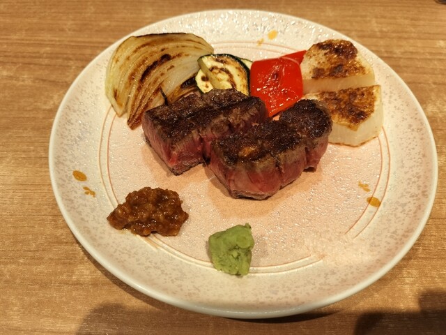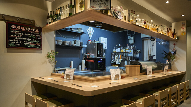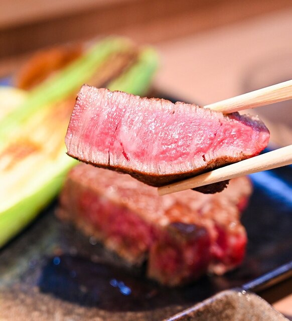当店の自慢は、五感で楽しめる鉄板焼ステーキ。高級料理店出身のシェフが目の前で丁寧に焼き上げるステーキは、味覚だけでなく視覚や聴覚も満たします。特に“ヒレ”は、旨みと甘い脂が絶妙なバランス。全国から厳選したお肉を、岩塩やあけがらし、わさびでどうぞ。