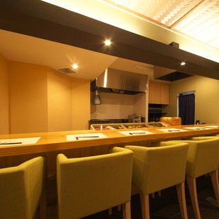 木の温もりが溢れる落ち着いた雰囲気の当店は、カウンター席が7席のみ。料理人とお客様との距離が近いので、より臨場感が感じられます。炭火の弾ける音、お出汁のやさしい香り、目の前で繰り広げられる職人の技など、お料理が手元に届くのがより待ち遠しくなる贅沢な時間を感じてください。目、耳、鼻、温度、味、五感全てで「源勘」をご堪能できるのは、距離の近いカウンター席ならではです。