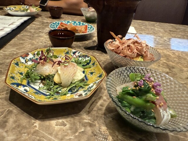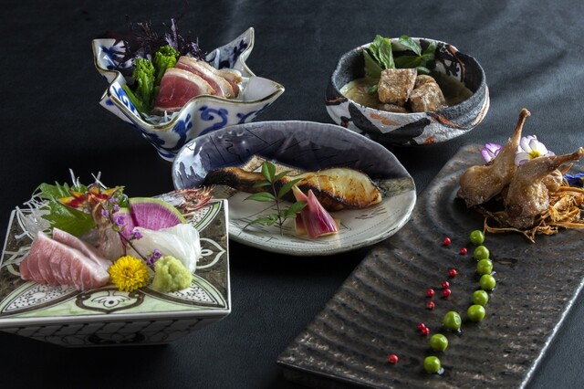 三河湾で獲れる鮮魚を中心にその時々の季節が育む旬の食材を使用。それら上質な素材を活かした料理の数々を存分にお楽しみいただける【おまかせコース】をご用意しております。料理は、美しい盛り付け・色合い・器による〝視覚〟、鼻を掠める〝嗅覚〟など、五感に響くもの。一品ごとに至福と感動を覚えていただける、そんな料理をぜひコースでご堪能ください。