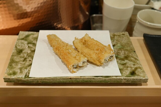 たとえば穴子なら、3日前に仕入れて冷たい水の中で半冬眠状態に。揚げる3時間前に捌いてあえて空気に触れさせてから、ぬめりを取らずに低温の油で揚げる。身と皮の臭みを除きつつ、旨みを最大限に引き出すために編み出した方法だ。ウェルダン気味に揚げてコースの最初と最後に出すエビ、何度も温度を上げ下げしながら時間をかけて揚げる芋なども、すべての技が論理的思考と繰り返しの検証によって生み出されている。
