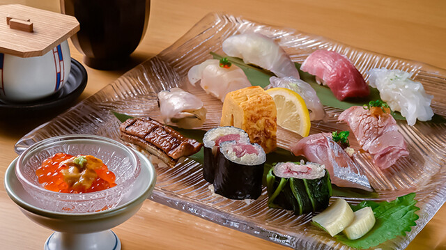 四季折々の厳選食材を用いたアラカルトも充実。旬彩旬魚を活かした煮つけをはじめとする季節の一品料理は、職人の繊細な技が息づく滋味深い味わいが魅力です。また《寿司会席コース》では、小鉢や季節の煮物など多彩なラインナップをご提供。こだわりのお寿司と共に贅沢なひとときをお愉しみください。