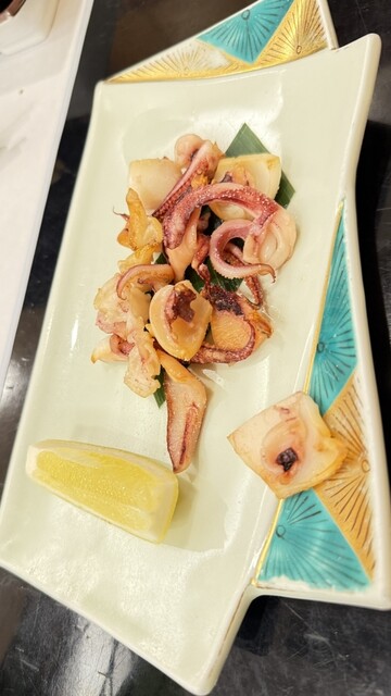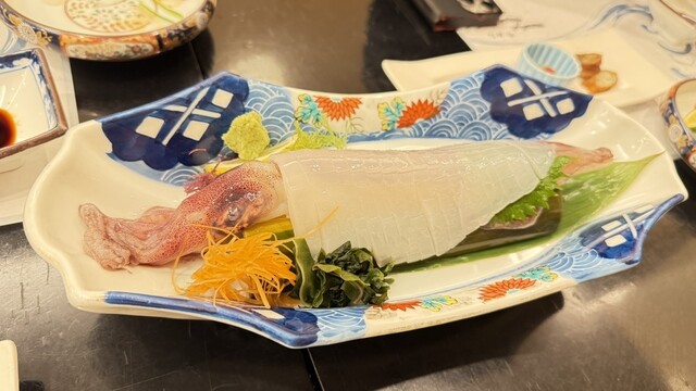 毎日市場より入荷した金崎産の"ヤリイカ"は、生け簀から最高の状態でご提供いたします。鮮度抜群の「活造り」は身が透けるほど新鮮で、イカ本来の濃厚な甘みとコリコリとした歯ごたえが堪らない逸品。お刺身は、お醤油とすりおろしの生わさびで、お召し上がりください。他にも、サクサクの「天ぷら」や、香ばしい「塩焼き」など、様々な一皿をご用意。活イカの鮮度を活かした絶品の数々を、ご堪能いただけます。