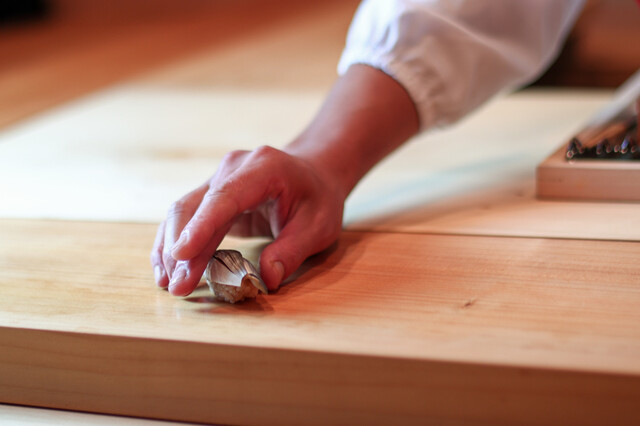 毎日、店主自ら市場にてネタを厳選。産地・銘柄にはこだわらず、実際に目で見て手に触れて一番上質なものだけを仕入れております。鮮度が命のネタの中から、より良いものを見極めてご提供。そして、鮨のもうひとつの顔とも言うべきお米は、寿司ネタと好相性な国産米を100%使用しております。仕込みには、営業時間以上に時間も手間暇をかけているのです。すべては、お客様の「美味しい」にお応えするために…。