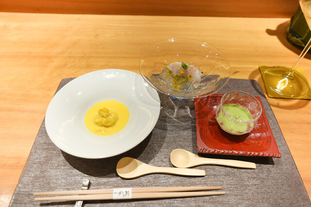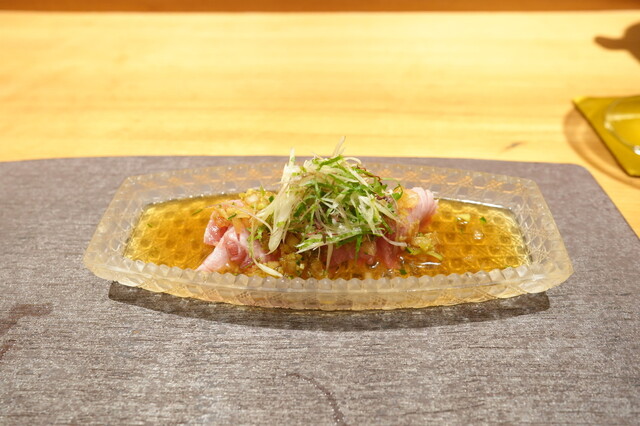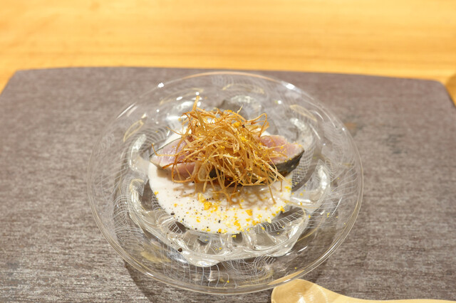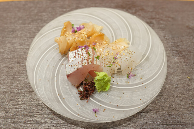 海と山の多様な魅力をそなえる広大な福島県のほぼ中央に位置する郡山。鉄道と高速道路の交通の要衝であり、空港も近い郡山は、県内や隣県はもちろん、全国から新鮮な食材を手に入れることができる。たとえば、ある日のお造りは相馬のヒラメ、長崎の本マグロ、天草のサワラとアオリイカ、御宿のキンメ。そこに、地元産オレンジを低温乾燥させた、酵素が残るオレンジパウダーを添える。醤油も県内で手造りで醸造されている逸品だ。