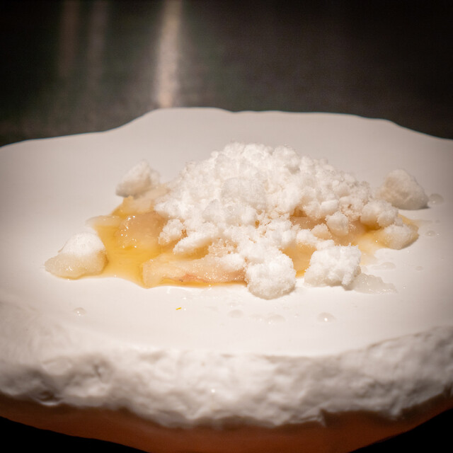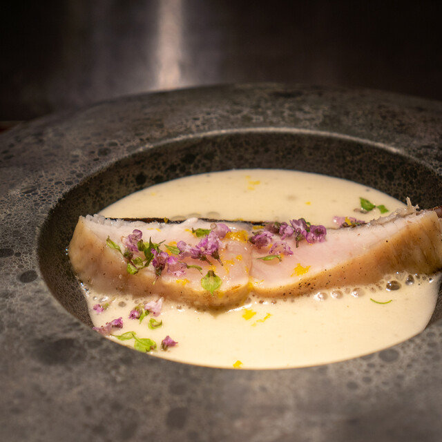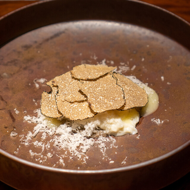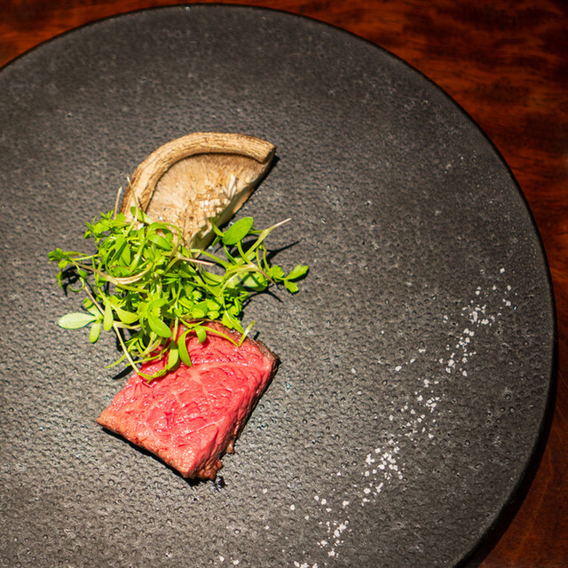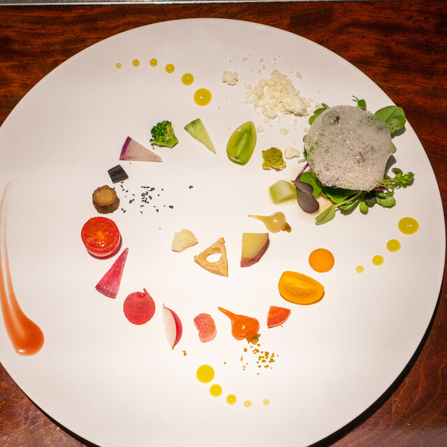 ディナーコース冒頭のハイライトが、60品目以上に及ぶ野菜の一皿「旬の野菜プレート」。広島県北広島町産を中心に選んだ旬の野菜には、茹でる、揚げる、マリネするなど、それぞれの野菜に適した調理法が施される。また終盤にメインで供されることが多いのが、和牛のルーツといわれる竹の谷蔓(たけのたにつる)や、いぶさな牛(竹の谷蔓牛と和牛を掛け合わせた牛)。この稀少な牛肉を求め、全国から食通が詰めかけるほどだ。