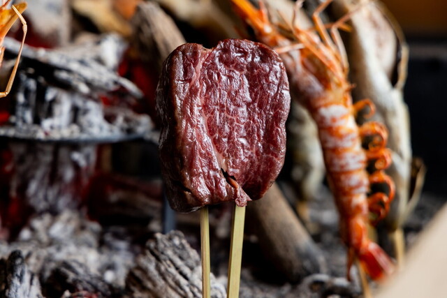 食材は北海道産を中心に、生産者と直接契約し鮮度抜群かつ厳選した食材のみを仕入れています。炭は香りがよく、火の強さが一定の高級『北海木炭』を採用し、魚は串に通した食材を囲炉裏に立てて焼く『原始焼き』でご提供。炭火との距離を調整することで、表面は香ばしく中はふっくらと仕上がるのが特徴です。食材の良さを最大限に出した火の入れ方、また素材の味をシンプルに楽しめる味付けをぜひお楽しみください。