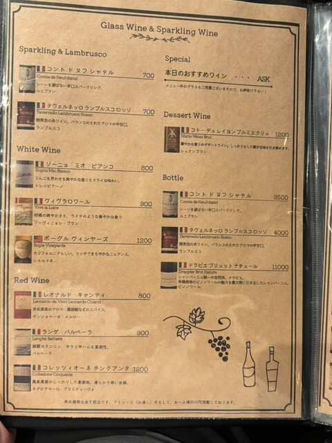 ※ワインの持ち込みの際抜栓料として1本2500円いただいております。