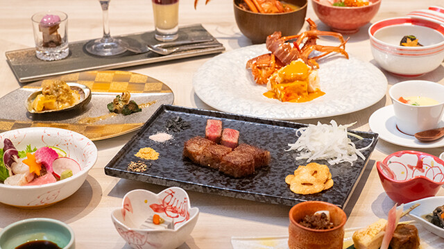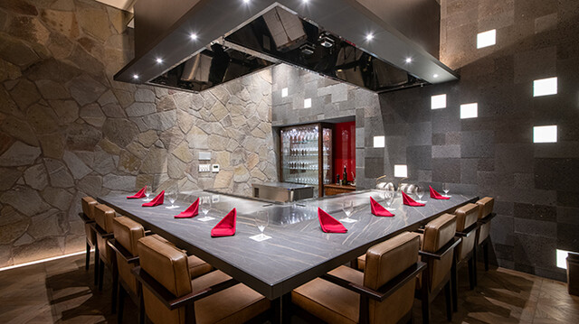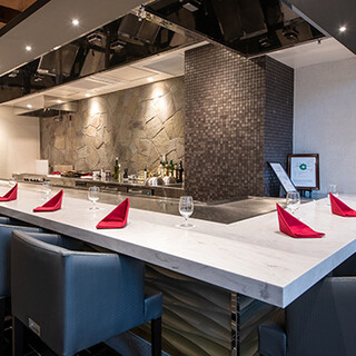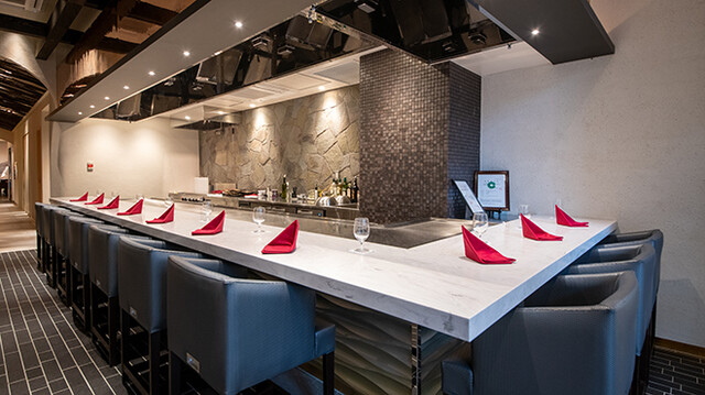 シェフがお客様の目の前で焼き上げる、ライブ感溢れる演出をお楽しみいただける『カウンター席』は特等席。鉄板の上で、食材が焼き上がる瞬間の音や香り。そして、お料理を口に運ぶときの口当たり、味・見た目まで、五感で愉しむことができる特別な空間。記念日やデート、接待など様々なシーンでご利用いただけます。