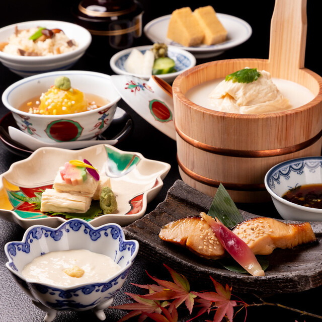 季節の美味を盛り込んだ京懐石をご用意しております。その時の美味しい旬食材を楽しんでいただきたく、内容は毎月変更。自家製の湯葉や豆腐、京野菜など、地場の食材もふんだんに、器に彩りました。素材の粋を尽くした旬の美味で、皆様をおもてなしさせていただきます。京都の四季を感じる奥深い味わいをご堪能ください。