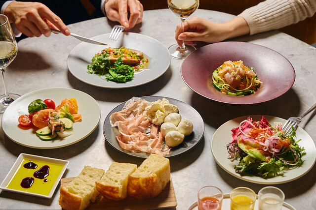 一皿ずつ丁寧に仕上げた選べるメイン。種類豊富なサラダバーや季節ごとの食材を活かしたアンティパスト、自家製のリコッタチーズや、本場ナポリで活躍したピッツァイオーロが窯で一枚ずつ焼き上げた数種類のピッツァなどをビュッフェスタイルでお楽しみいただけます。更に、ふわっとした優しい舌触りが特徴のプロシュットをサラダやピッツァにカスタムする贅沢さも。自由さと上質さを兼ね備えた新しいランチ体験をお届けします。