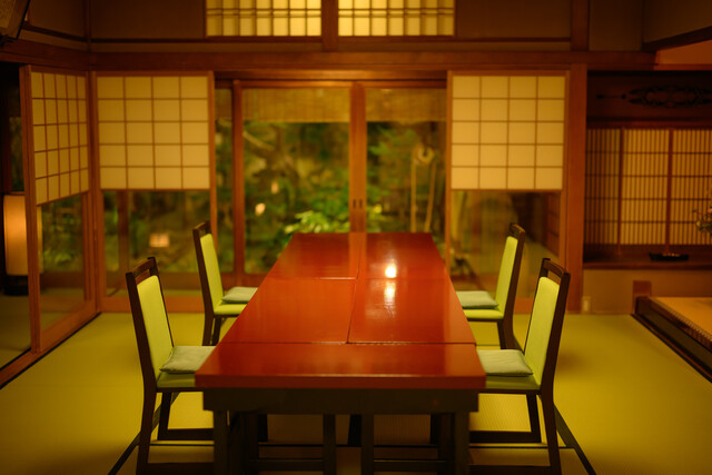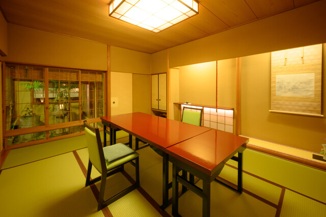 完全個室(個室内に洗面トイレ有)でございます。 また全てのお部屋より本庭もしくは坪庭を眺めていただくことができます。 テーブル席もしくは掘りごたつのどちらかのお部屋へのご案内になります。 広間は最大25名様までご利用いただけます。15名様以上のご予約は直接お電話にてお願い申し上げます。
