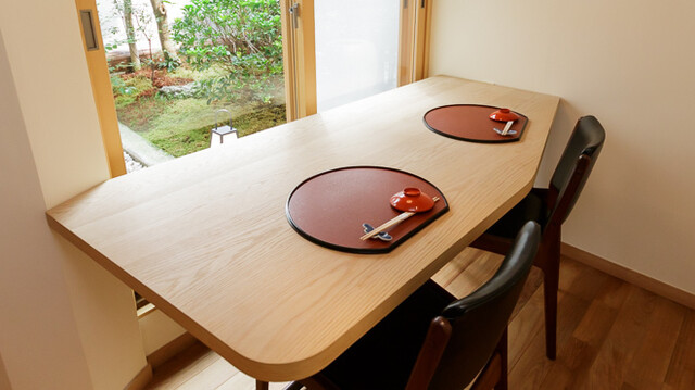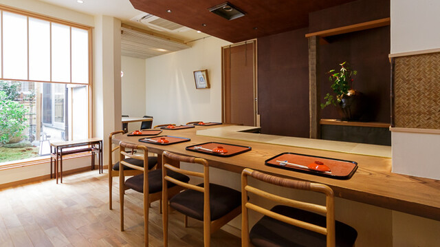 釜座通、京情緒溢れる町並みの一角に佇む【御所岩さき】。和紙の壁紙や格子、床の間に飾られた花が美しく、和の趣溢れる店内です。お席は、特別感のある雰囲気が愉しめるカウンター席、お連れ様と語らいながら過ごせるテーブル席をご用意。広々とした空間にて、窓に広がる庭を眺めながらゆったりとお寛ぎいただけます。ご家族、友人とのお食事はもちろん、大切な記念日にも最適。心を込めておもてなしさせていただきます。