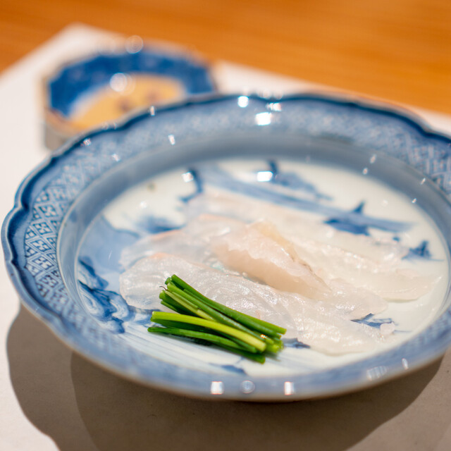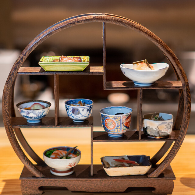季節の食材を用いた、全8品目のお料理で違い棚を彩ります。その日の仕入れや時期でいちばん美味しいものを味わっていただきたい一心で、様々な調理法でご用意しております。鮮やかな色彩の食材を盛り付ける器にももちろんこだわっており、視覚でも味覚でもお愉しみ頂ければ幸いです。こちらの違い棚は、ランチは11,000円より、ディナーは3品5,500円のうちの一品としてご用意致しております。
