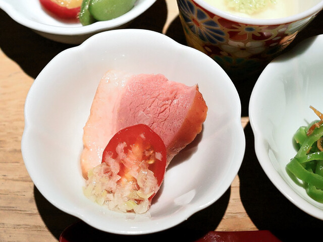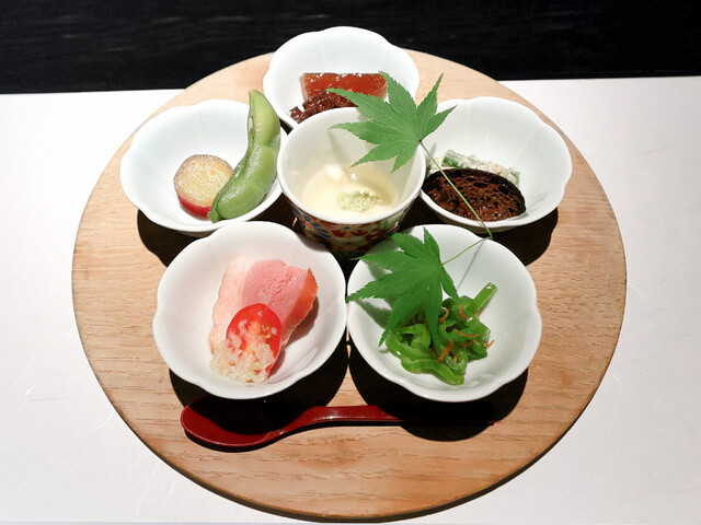 おちょぼ口の舞妓さんでも食べられるひと口大の“豆すし”。目でも楽しめる小さな宝石箱のように愛らしい一品です。その他、旬のもの・美味しいものを少しずつ味わえる豆皿料理などをご用意しております。京料理の伝統を重んじながらも、型にとらわれない独創的な和の味をお楽しみいただけます。