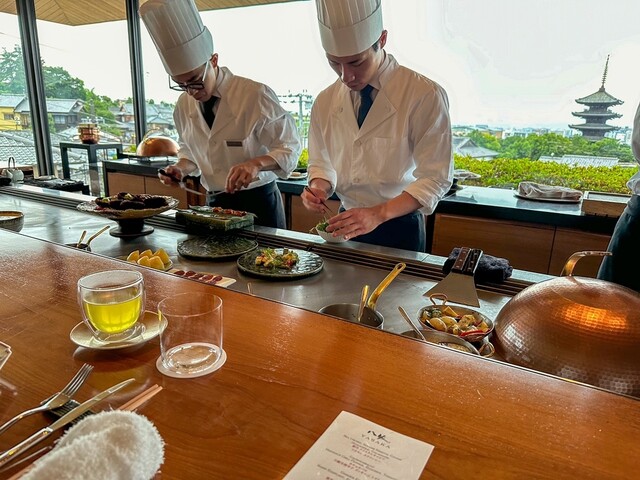 パークハイアット京都の4階に位置する「八坂」。京都市街地を一望する10席のカウンターを2室備え、眼下には美しい瓦屋根の街並み、正面には八坂の塔と京都タワーをアートピースのように収めた風景が広がります。これほど京都らしい景色は、なかなかお目にかかれません。夜には八坂の塔がライトアップされ、幻想的な雰囲気に包まれます。そんな絶景をフレンチの技術を駆使した鉄板焼きと共に。記憶に残る夜をお過ごしください。