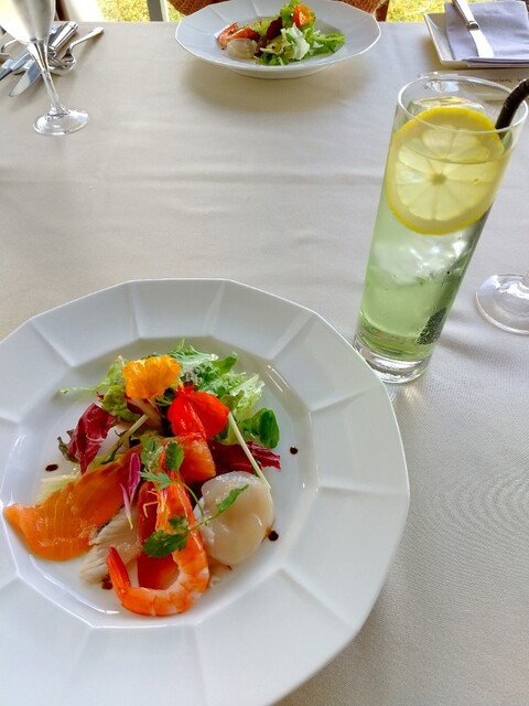 リゾート内で栽培されたハーブをふんだんに用いたフレンチコース 昼はさわやかな高原の景色を 夜は素敵なイルミネーションを見ながらの食事を楽しむことができます