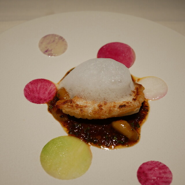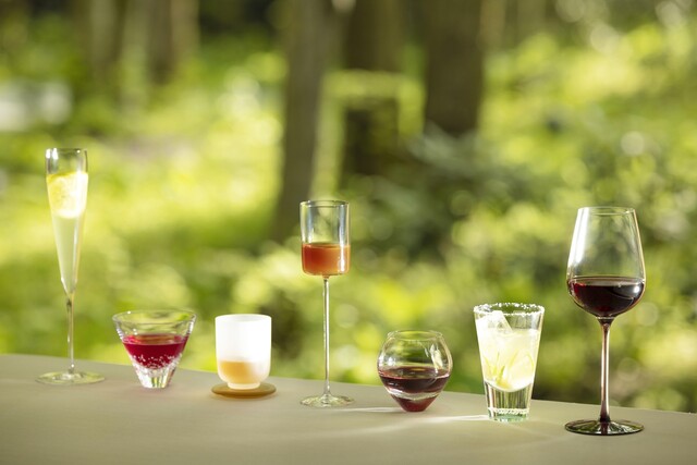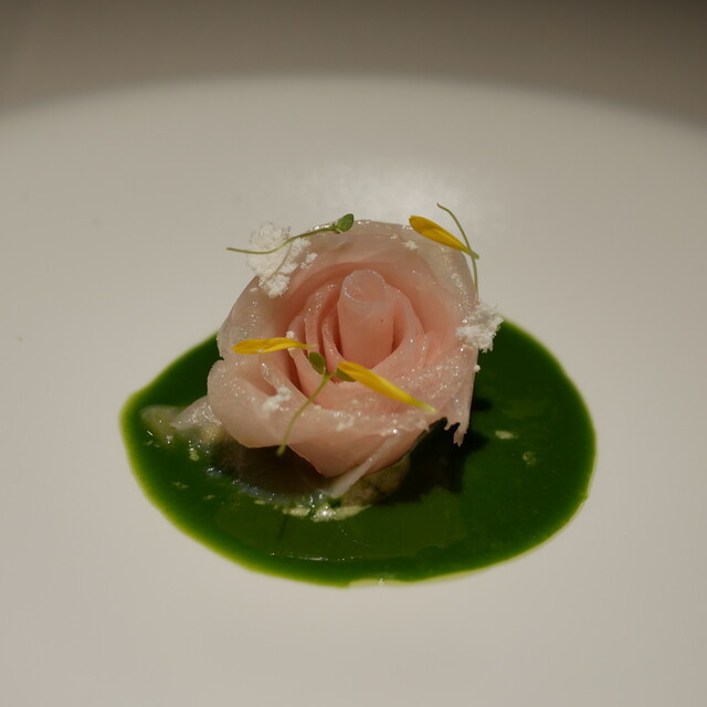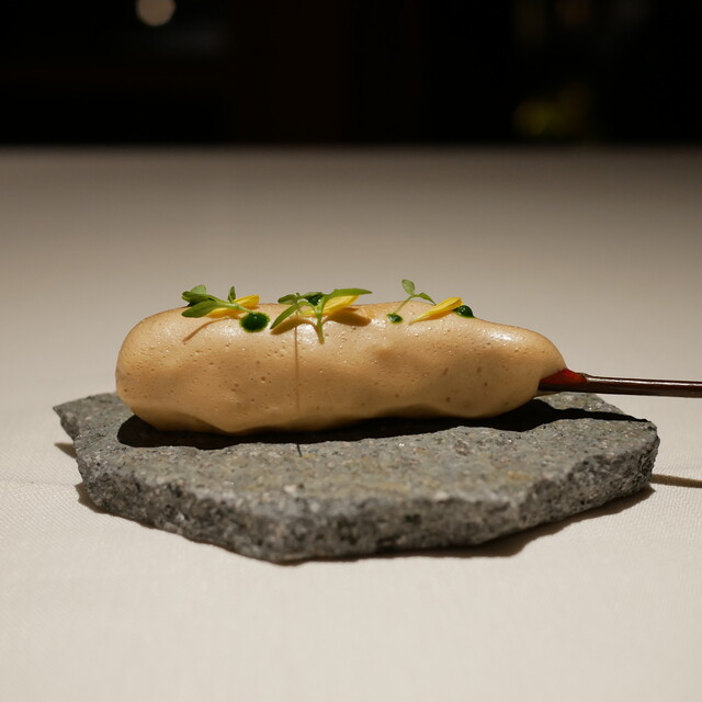 緑豊かな森を進み扉を開くと、そこに広がるのは開放的な非日常空間。吹き抜けのワンフロアに配されたテーブルには職人技が光る器やカトラリーが配され、洗練された空間に彩りを添える。最高の料理をベストなタイミングでサーブできるよう、ゲストは9組まで。心地良い接客もまた、記憶に残る特別なひと時を約束する。店名の由来でもある湯川の流れのように、ゆったりと至福の時を愉しみたい。