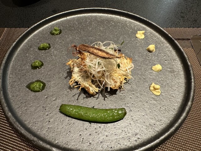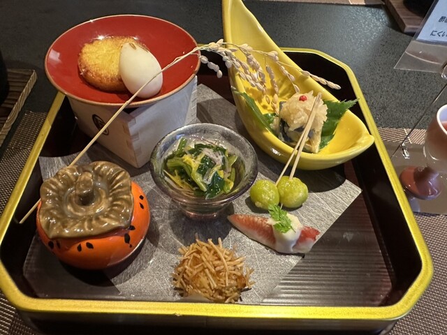 昨年来て、気に入ったこちらに訪問。 部屋からの眺望が良い。 夕食は、個室になったレストランで 料理は少し捻りがありますが、捻りすぎず 調和が取れており、音楽が流れるような軽快な お料理でした。 前菜 百合根 いちじく 南京 ワタリガニ 銀杏 ほうれん草の御浸し セロリと貝...