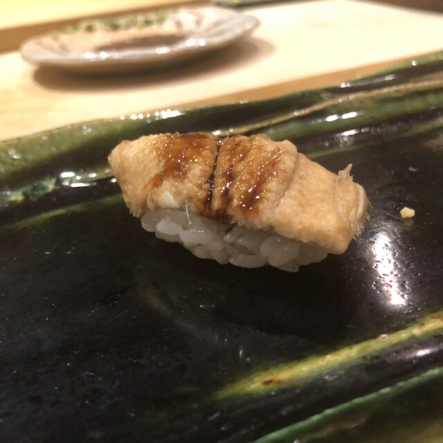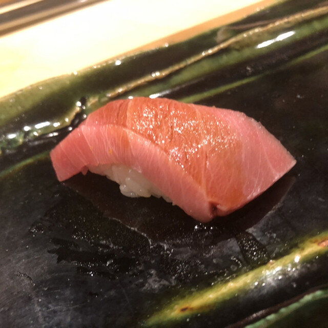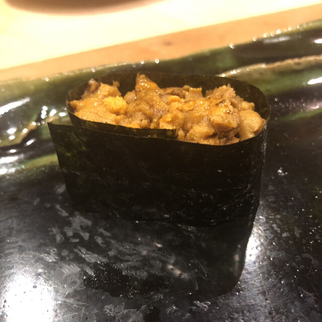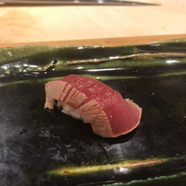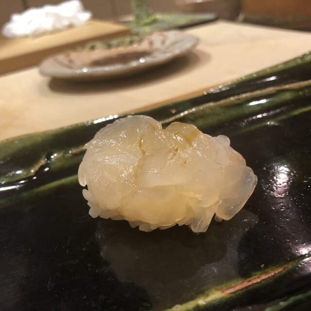 JR各線大分駅より徒歩10分。ガレリア竹町商店街にあるデザインビルの1階に、『月の木』はあります。入ってまず、印象的なフラットなカウンター。「大分県食材で、どこまで江戸前寿司の世界に迫れるか」という探究心がちらり、と見える、当店はコースのみの提供となっています。お造りと、お寿司が中心のコースの中で、味わっていただきたいツマミは「タラコのわさび漬け」。塩タラコをわさびに漬けて、軽く炙った一品。県産の
