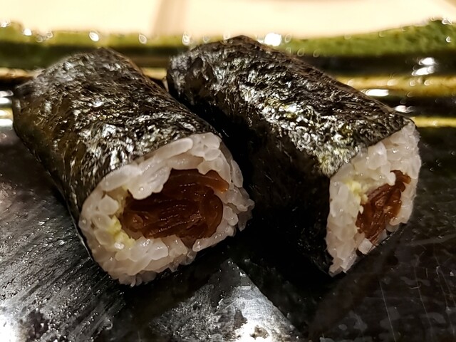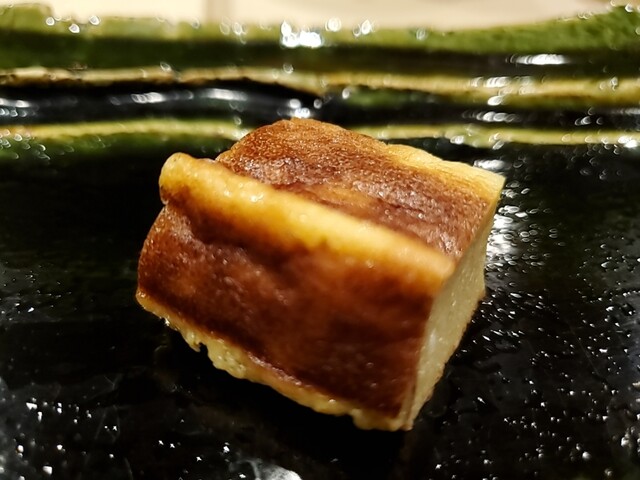 JR各線大分駅より徒歩10分。ガレリア竹町商店街にあるデザインビルの1階に、『月の木』はあります。入ってまず、印象的なフラットなカウンター。「大分県食材で、どこまで江戸前寿司の世界に迫れるか」という探究心がちらり、と見える、当店はコースのみの提供となっています。お造りと、お寿司が中心のコースの中で、味わっていただきたいツマミは「タラコのわさび漬け」。塩タラコをわさびに漬けて、軽く炙った一品。県産の