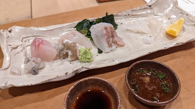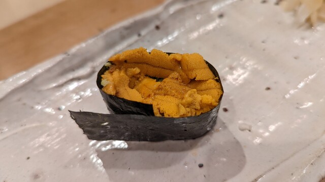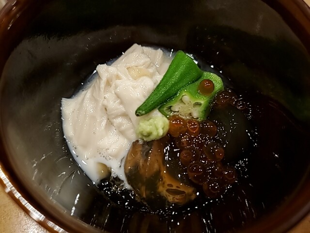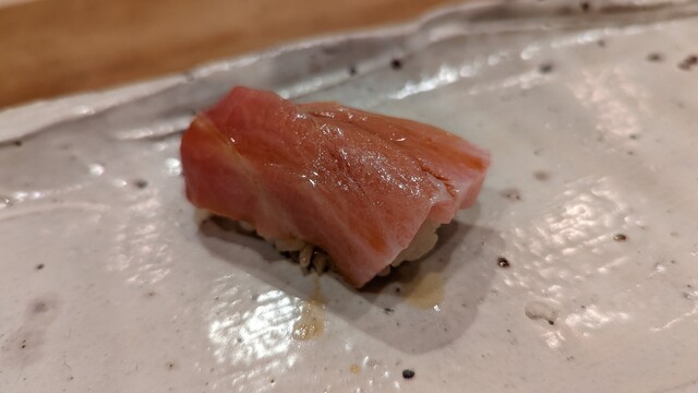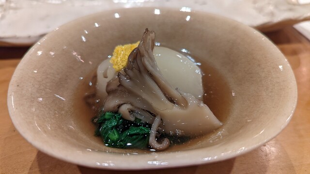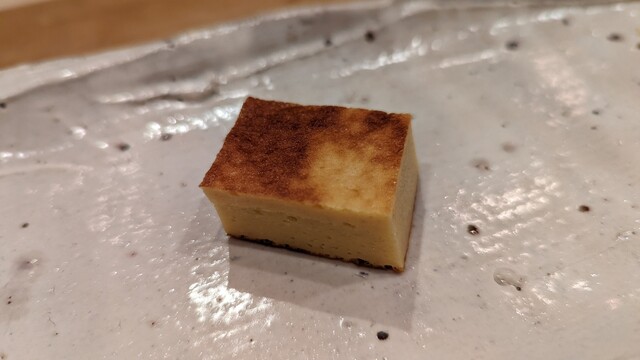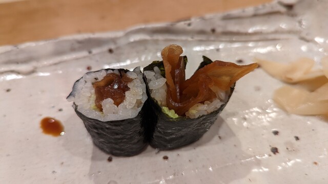 JR各線大分駅より徒歩10分。ガレリア竹町商店街にあるデザインビルの1階に、『月の木』はあります。入ってまず、印象的なフラットなカウンター。「大分県食材で、どこまで江戸前寿司の世界に迫れるか」という探究心がちらり、と見える、当店はコースのみの提供となっています。お造りと、お寿司が中心のコースの中で、味わっていただきたいツマミは「タラコのわさび漬け」。塩タラコをわさびに漬けて、軽く炙った一品。県産の