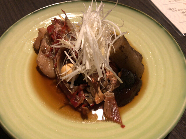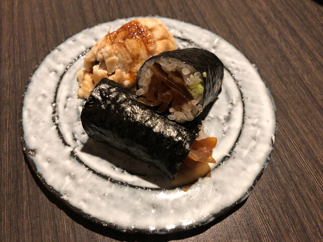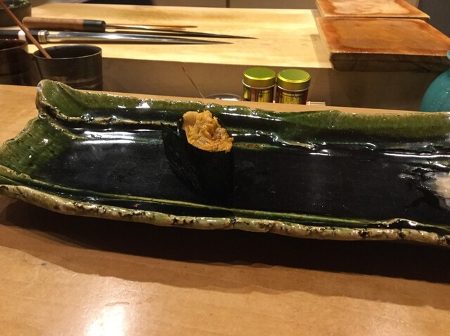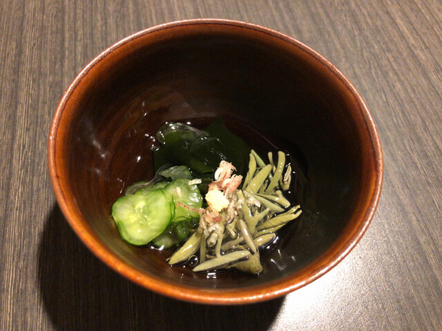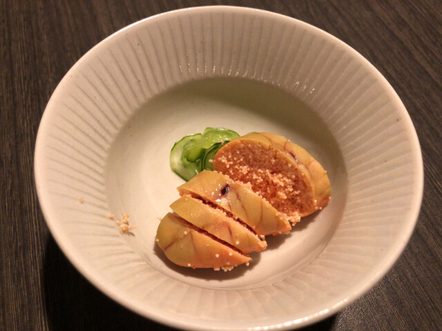JR各線大分駅より徒歩10分。ガレリア竹町商店街にあるデザインビルの1階に、『月の木』はあります。入ってまず、印象的なフラットなカウンター。「大分県食材で、どこまで江戸前寿司の世界に迫れるか」という探究心がちらり、と見える、当店はコースのみの提供となっています。お造りと、お寿司が中心のコースの中で、味わっていただきたいツマミは「タラコのわさび漬け」。塩タラコをわさびに漬けて、軽く炙った一品。県産の
