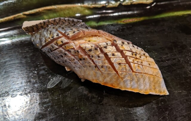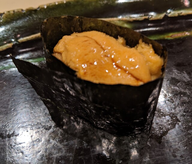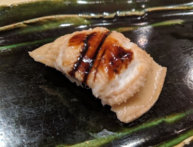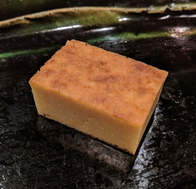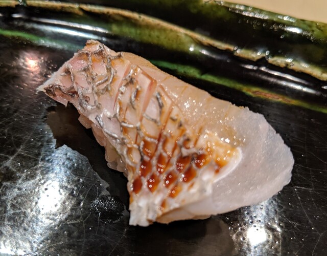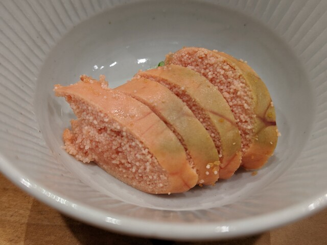 JR各線大分駅より徒歩10分。ガレリア竹町商店街にあるデザインビルの1階に、『月の木』はあります。入ってまず、印象的なフラットなカウンター。「大分県食材で、どこまで江戸前寿司の世界に迫れるか」という探究心がちらり、と見える、当店はコースのみの提供となっています。お造りと、お寿司が中心のコースの中で、味わっていただきたいツマミは「タラコのわさび漬け」。塩タラコをわさびに漬けて、軽く炙った一品。県産の