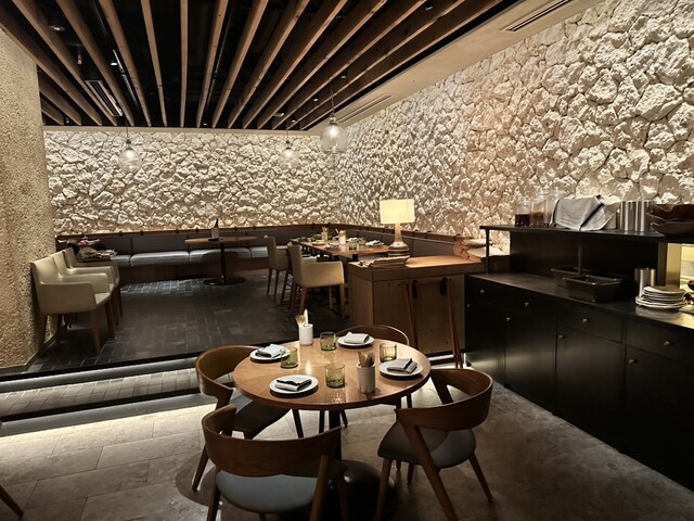 1Fのメインダイニングにはカウンター席やテーブル席など98席、テラス席は1・2階に50席以上、地下のバーには60席と豊富なお席をご用意。バーやテラス席に自由に移動も可能です。席数が多いため10~20名様の小団体のお食事にも便利。店内は、木や琉球石灰岩を使用した壁に、南国を思わせるグリーンを取り入れた、ゆったりと落ち着ける空間です。ホテル宿泊客はもちろん、観光客や島民の方々もお気軽にご利用ください。