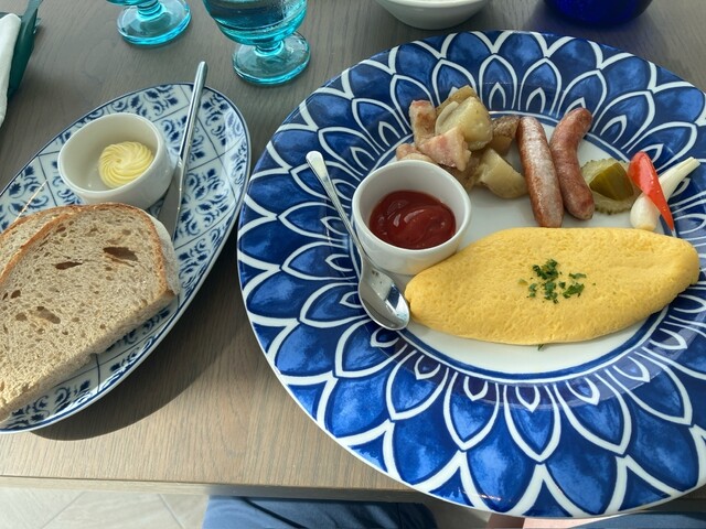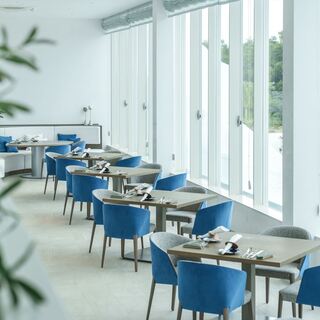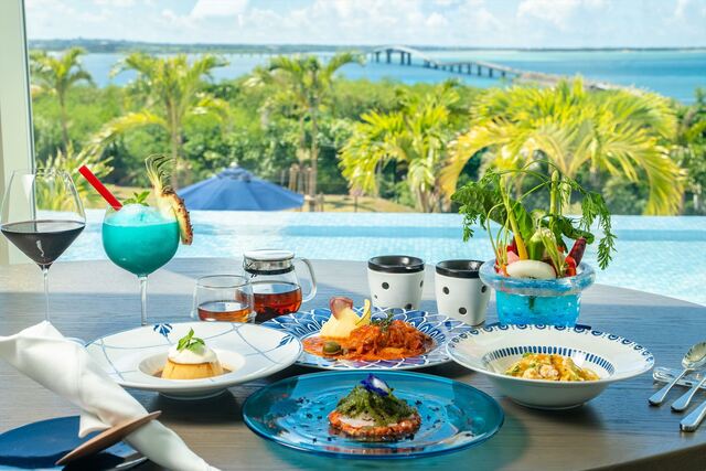 目の前に宮古ブルーの圧巻のパノラマビューが広がります。伊良部島・サントリーニホテル&ヴィラズ内に位置する当レストランはご宿泊以外でもお気軽にご利用いただけます。