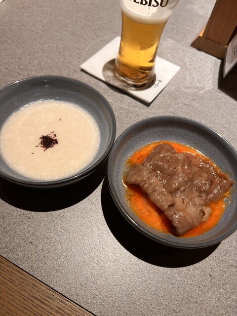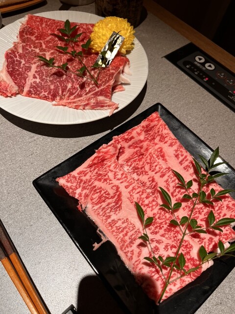 "~しゃぶしゃぶ~黒毛和牛ならではの美味しさをストレートに。さっとコブをくぐらせポン酢orごまだれで是非~すきやき~程よい甘さと醤油の香ばしさが絶妙の自家製割り下。卵にお肉が絡めば絶品!"