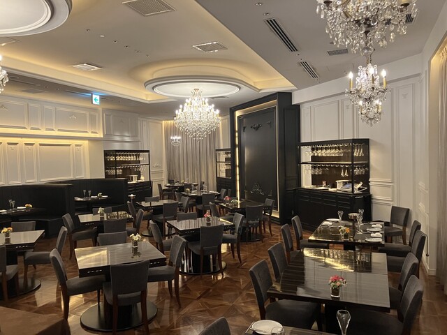シャンデリアが輝くモダンな空間。大切な記念日を彩る、落ち着いたテーブル席です。