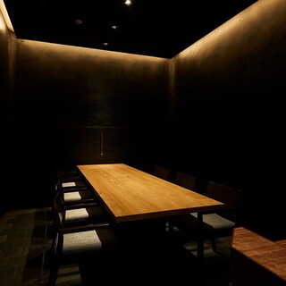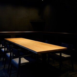 大人の街・北新地の一角に佇む当店。自動ドアを開けると、漆喰の落ち着いた店内にテーブル席とカウンター席が程よく広がります。デザインを手掛けたのは世界的に活躍する柳原氏。シンプルで洗練された空間が、本日のおまかせ料理への期待を自然と高めてくれます。また、1室のみの完全個室も魅力のひとつ。