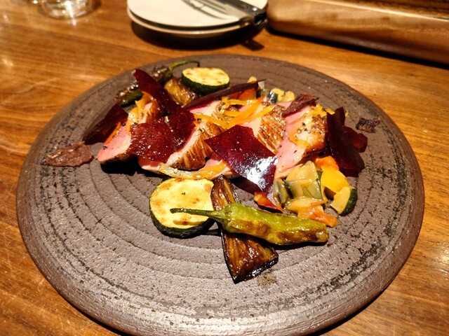 低温と超高温の薪焼き調理でジューシーに仕上げた肉料理