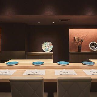 隠れ家的お店としてご利用いただける当店。入口には異空間を演出する小上がりが広がります。ホテルのような気品のある店内は、6.4mあるL字の大きなカウンターを完備。ネタケースがなく、調理風景を目の前で眺めながら板前との会話を楽しめます。ほかにも海外の”モンキーポット”の木を使ったテーブルが自慢の個室は、4名様~8名様用の3部屋を完備。また、お手洗いは男女別々でご用意。大切な会食や接待にも最適です。