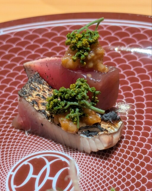 当店のお品書きはおまかせコース1種のみ。先付けの季節の魚から始まり、お刺身や焼き物をご用意いたします。その後、イカなどのタンパクなものから熟成マグロ、うになど旬の寿司を約12貫ご提供。ほかにも藁で炙った料理や茶そばの天ぷら乗せなど、自慢の一品が揃います。お口直しには幻の青肉メロンと呼ばれる”キングメルティ”のシャーベットをどうぞ◎追加注文もできるボリューム感ある至高のコースをご堪能ください。