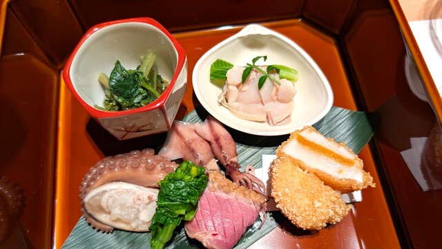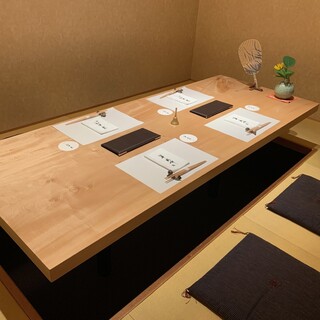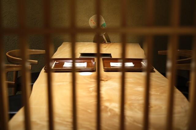 天井が高く開放感のある空間は、木材をふんだんに使った和のデザイン。店内には、目の前で調理風景が愉しめるカウンター席、半個室タイプのテーブル席、2~10名様までの個室を完備しております。日本料理店の中では珍しく席数が多いのも、当店ならでは。コースは20:30からの開始も承っているため、少し遅い時間からのお食事に最適です。家族・友人とのお食事のほか、接待などのビジネスシーンにもぜひご利用ください。