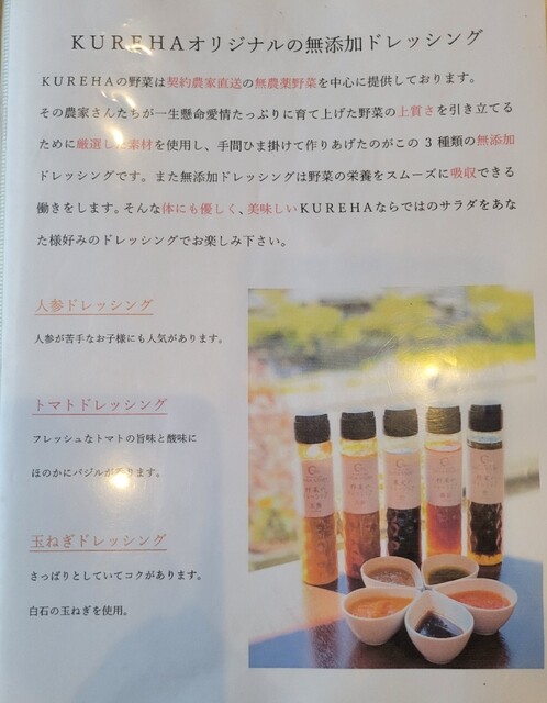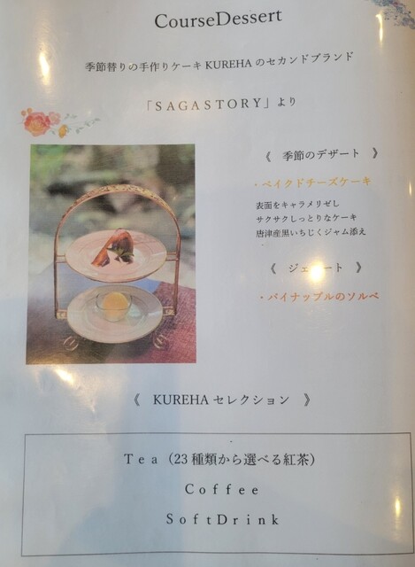 四季を通じて自然を楽しめる川上狭にあり「上質な料理」「紅茶」を味わうことのできるレストランKUREHA。花鳥山水の彩る風景を眺めながら、素材を生かした無添加料理が自慢。ミシュラン三ツ星レストランの元料理長の元で修業を積んだオーナー自らが手掛ける「無添加料理」は“体にやさしいだけでなく、素材の良さを生かした”美味しさを多くの方に伝えたいという思いが込められています。国内最高峰の伊万里牛や、契約農家直