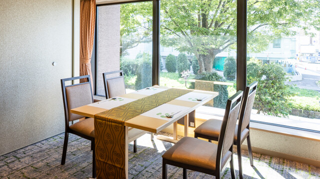 大きな窓から氷川参道の美しい風景を望む、開放感あふれる空間が魅力。内装も参道の景観と調和するようにデザインされており、日中は緑豊かな自然を感じながらランチをお愉しみいただけます。ディナータイムには、少し照明を落とした落ち着きのある雰囲気の中で、ゆったりとお食事を。貸切のご要望にもお応えいたしますので、どうぞお気軽にご相談ください。