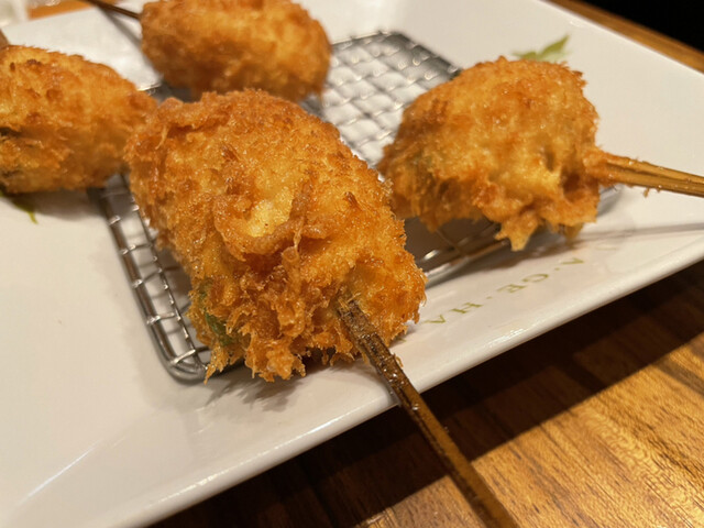 女性のお客様からご好評いただいている「豚バラ赤ワイン煮込み」。5~6時間煮込んで一晩熟成させた豚バラ肉を使用しています。味がしっかりと染み込んだほろほろなお肉を、当店こだわりのサクッと軽めの衣に纏い皆様のもとへお届け。そのほか、魚介や野菜の串、ご飯ものまで種類豊富なラインナップ。お集りの際には『旬菜コース』(4,000円)はいかがでしょうか。季節串から定番串まで味わるおすすめのコースでございます!
