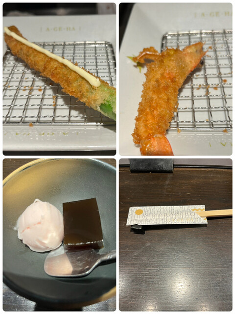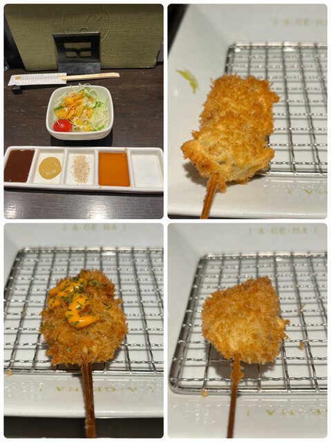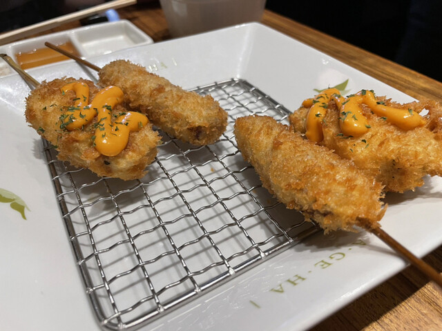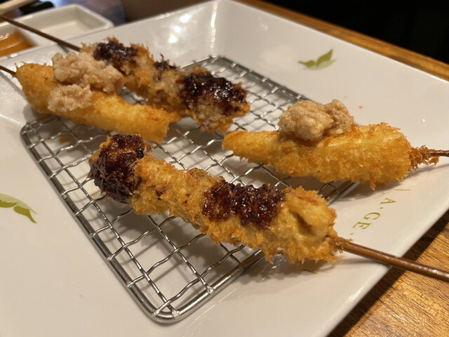 当店人気メニューのひとつ「子持昆布と山芋ウニソース」。プチプチ食感の子持ち昆布と山芋のサクサク感がクセになる串に仕上げました。揚げることで普段と異なる食感が楽しめるほか、上にかけられたウニソースの濃厚さも絶妙。ほかにも、こだわり素材をシンプルに揚げた贅沢な一本をお届け☆食材に合わせて添えた調味料をつけてどうぞ。アスパラを丸々一本使用したインパクトのある「アスパラの豚肉巻」もおすすめです◎
