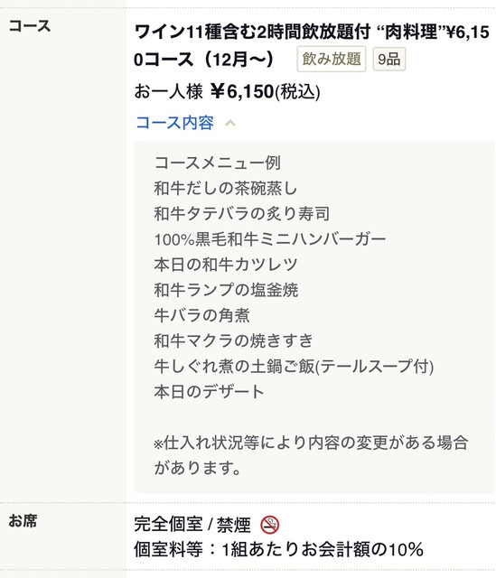 個室料別途 10% 頂戴致します。TEL: