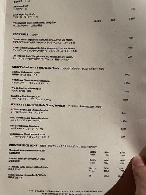ディナータイム サービス料 10%