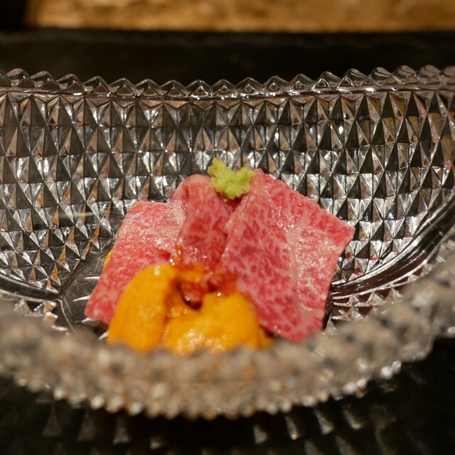 天井が高く開放感あふれるシンプル和モダンな空間。一際目を引くバカラのシャンデリアが高級感を演出します。鉄板フロアには、銀座の夜景を一望できるカウンター席をご用意。さらに奥に進むと、焼肉を愉しめる落ち着いた完全個室を完備しております。洗練された雰囲気は、お誕生日などの特別な日やご会食にも最適。店内は段差がございませんので、車いすのお客様もお気軽にご来店いただけます。ぜひ、幅広い用途でご利用ください。