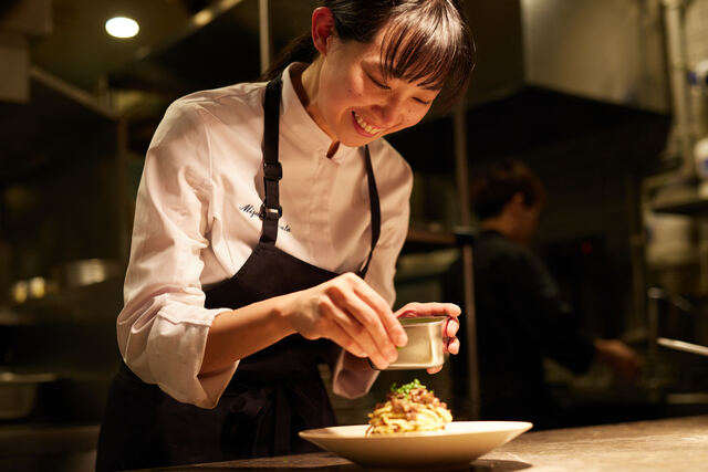 新時代の若き才能を発掘する、日本最大級の料理人コンペティション「RED.U-35」で受賞。「細やかな仕事も好き」と語る彼女が、クラシカルな料理を華やかに、繊細に、エモーショナルに昇華します。生まれ育った三重県伊勢での体験、絵や建築を学んで得た感覚、実家のパティスリーでの修練、ヨーロッパ各国での刺激。それらすべてを、地域の魅力や文化を取り入れる「ガストロノミー」として、皿の上で表現します。