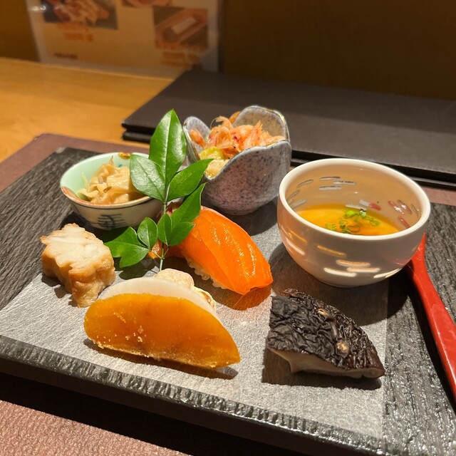 “割烹エリア”では、全国より厳選した食材や出汁の味わいを活かした料理をご用意しております。おすすめは全8品からなる13,000円のコース。中でも、終盤にご提供する「旬の酒肴八寸盛り」が当店の一押しです。日本料理の文化や伝統的な要素を取り入れた一皿は、舌だけでなく目でも季節を感じていただける逸品となっております。グラスで少量ずつお出しする日本酒と自慢の一品とのペアリングも併せて、ぜひご堪能ください。