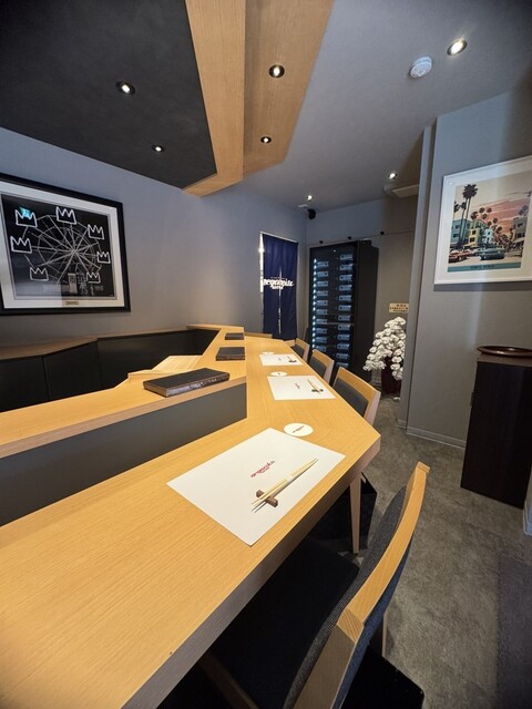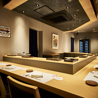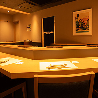 当店は日本橋駅B3出口から徒歩2分、東京駅八重洲北口から徒歩4分の好立地。有名画家のコラボアートやカリフォルニアの風景画が目を惹く店内では、80年代がメインのアメリカンポップスに耳を傾けながらゆったりとお寛ぎいただけます。調理場の向かいにあるカウンター席は、寿司を握る職人技を目の前で愉しめるライブ感が魅力。各種お集まりに最適な貸切予約も承りますので、ぜひ気軽にご相談を。