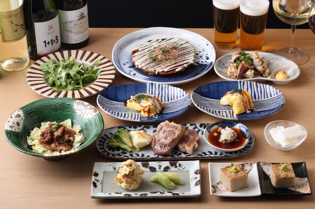 その時期に一番美味しい"旬"を鉄板焼きで気軽にお愉しみ頂ける当店。ディナーではすべてのコースでさまざまな鉄板焼きと、お好み焼きがお楽しみいただけるようになっています。おまかせコース=当店のお薦めを余すことなくご堪能いただけるいいところ取りコースとお考えください!もちろんアラカルトでのご注文も大歓迎。黒板メニューもありますので、お気軽にお声がけください。