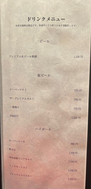 サービス料10%を頂戴しております。 (ランチ利用時はコースご注文のお客様のみサービス料10%を頂戴しております)